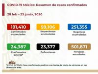 VIDEO En México hay 23 mil 377 muertos por Covid y 24 mil 387 activos Municipios PueblaMartes, Junio 23, 2020 - 19:11Se han registrado hasta el momento 191 mil 410 casos positivos acumulados en el paísLeer más