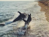 La mujer se llevó una sorpresa cuando su mascota, un simpático perrito de talla mediana, corrió hacia la orilla del mar y comenzó a jugar con un delfín