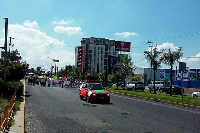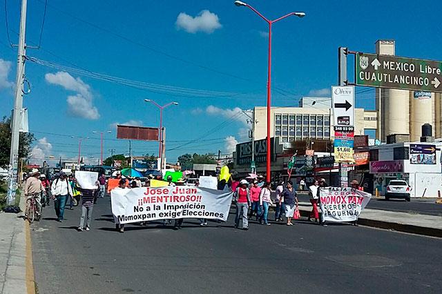 San Pedro Cholula, Pue.- Vecinos de Santiago Momoxpan marcharon por vialidades locales y estatales para exigir que se lleven a cabo las elecciones en la junta auxiliar y acusaron al presidente municipal, José Juan Espinosa Torres, de mentiroso y de querer cometer una imposición.