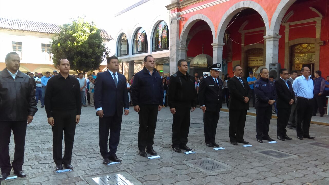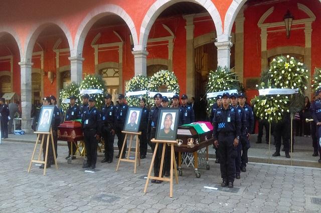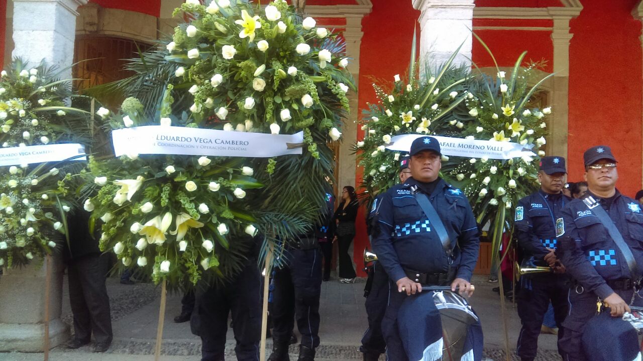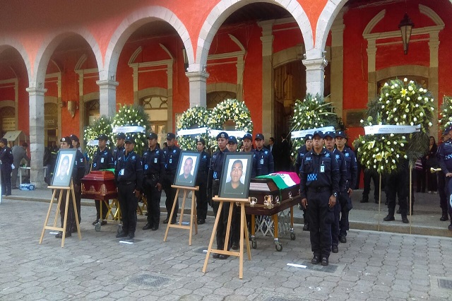 Desde temprano, la plaza cívica del Palacio Municipal de Huauchinango se llenó de hombres y mujeres con uniforme azul marino y vivos blancos que asistieron al último pase de lista a sus compañeros Maximino Montes Cortés, de 30 años, originario de Zihuateutla, Puebla; Narciso Hernández Gaspar, de 44 años nacido en Tihuatlán, Veracruz y Bernardo Ramírez del Ángel de 27 años de edad de Huauchinango.