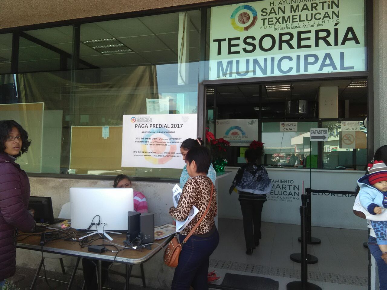 San Martín Texmelucan, Pue.- A pesar de que la Tesorería de San Martín Texmelucan ofrece descuentos del 20 al 15 por ciento para quienes paguen por adelantado su impuesto predial, la afluencia de contribuyentes a la ventanilla es mínima.