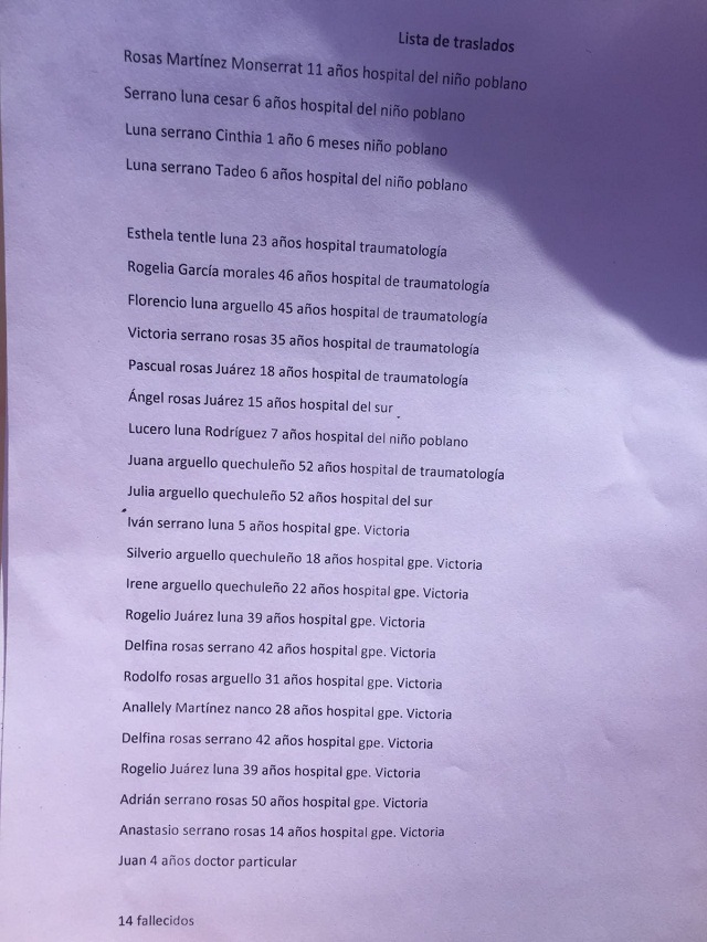 Esthela Tentle Luna de 23 años de edad (HTO), Rogelia García Morales de 46 años (HTO), Florencia Luan Arguello de 45 años de edad (HTO), Victoria Serrano Rosas de 35 años de edad (HTO), Pascual Rosas Juárez 15 años de edad,( HTO), Ángel Rosas Juárez de 15 años (HGS), Lucero Luna Rodríguez de 7 años de edad (HPN), Juana Arguello Quechuleño de 52 años de edad (HTO), Julia Arguello Quechuleño de 52 años (HGS), Iván Serrano Luna de 5 años de edad (HGGV), Silverio Arguello Quechuleño de 18 años de edad (HGGV), Irene Arguello Quechuleño de 22 años (HGGV), Rogelio Juárez Luna de 39 años de edad( HGGV), Delfina Rosas Serrano 42 años de edad (HGGV), Rodolfo Rosas Arguello de 31 años de edad (HGGV), Anallely Martínez Nanco de 28 años de edad(HGGV), Adrián Serrano Rosas de 50 años de edad (HGGV), Anastacio Serrano Rosas de 14 años de edad (HGGV), Juan de 4 años de edad atendido por medico particular.