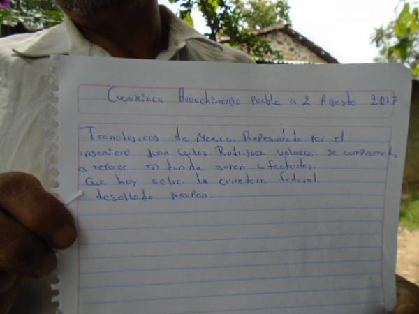 “También nos dijo que traía una orden del gobierno, porque la carretera ya es federal porque va hasta Pahuatlán y que no teníamos derecho a decir que no queremos dar el terreno para la obra porque ya el gobierno dijo que así debía ser. Nos dijo que ahí no podían hacer un puente, porque sale en 5 o 6 millones de pesos. Y que el gobierno cómo va a hacer un puente, si este camino no tiene casetas y no le deja nada de dinero. Así que nos prometió, hasta por escrito, que antes de que se vayan me tienen que van a hacer un muro, pero ya vienen las lluvias fuertes y el terreno se va y se va”, agregó.