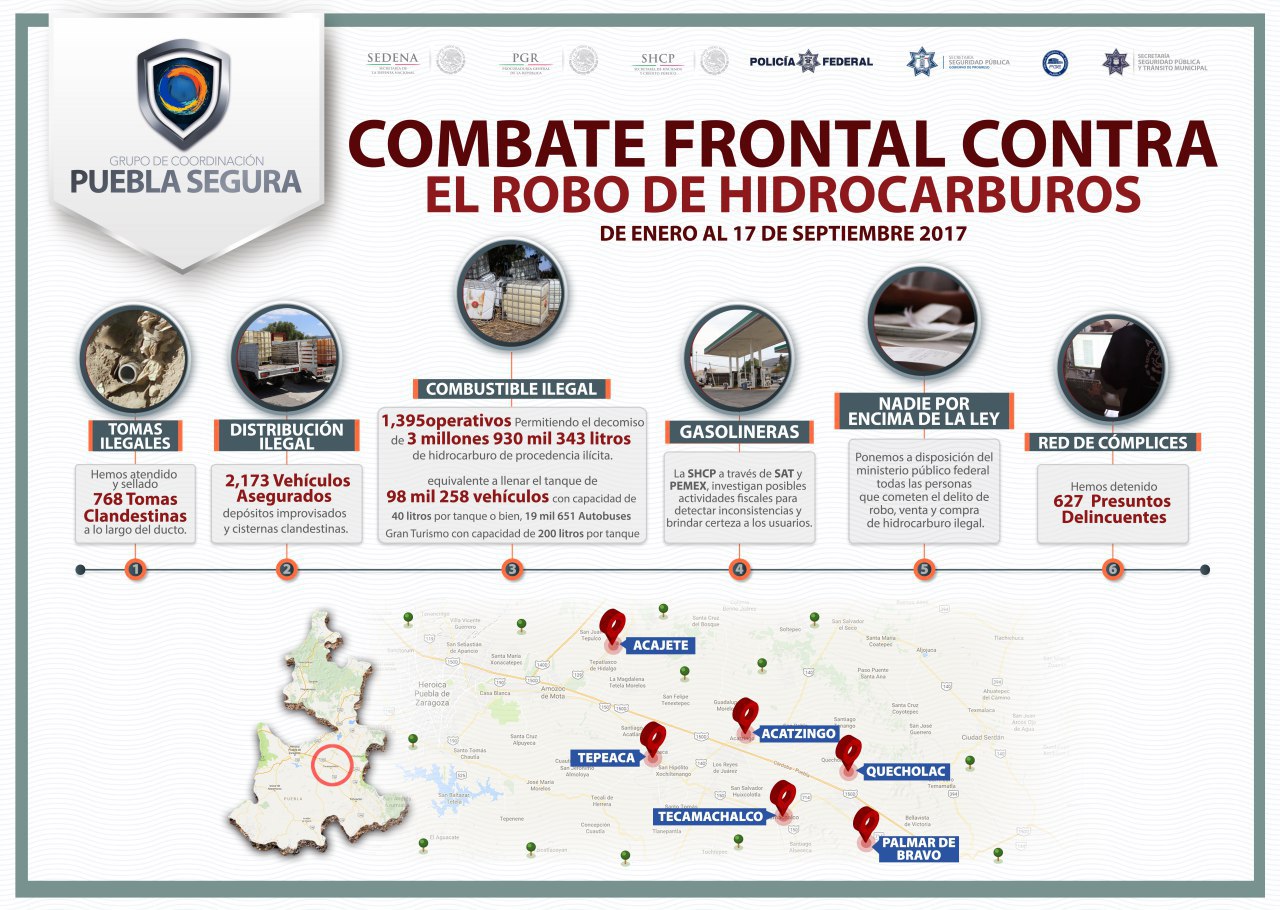 Las dependencias federales y estatales que integran el Grupo de Coordinación Puebla Segurainformaron que derivado de los 25 operativos realizados en la semana del 9 al 17 de septiembre se decomisaron 42 mil 465 litros de combustible robado.