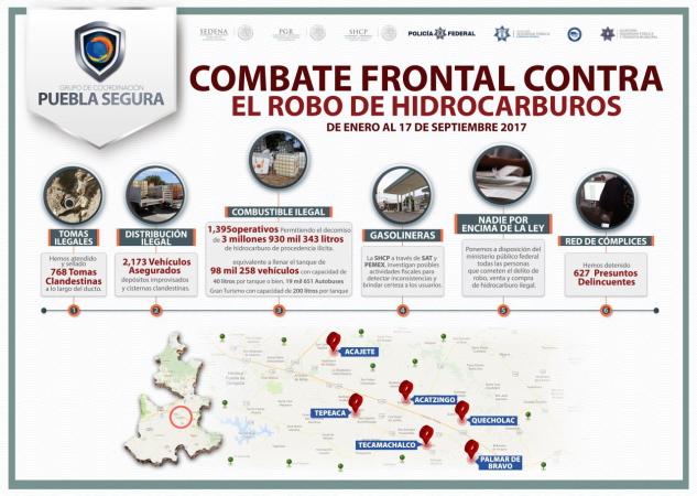 En lo que va del año se han realizado mil 395 operativos que han permitido decomisar 3 millones 930 mil343 litros de hidrocarburo robado, se han asegurado 2 mil 173 vehículos, 768 tomas clandestinas fueron selladas y 627 personas han sido puestas a disposición de PGR.