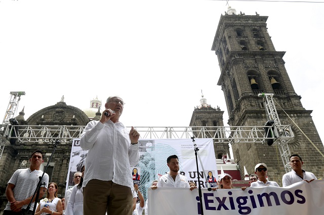 Tras pelearle por algunos minutos el micrófono y el templete a los organizadores, optaron por quedarse con el megáfono y organizar una movilización más, pero desde el Zócalo con dirección hacia la Fiscalía General del Estado (FGE).