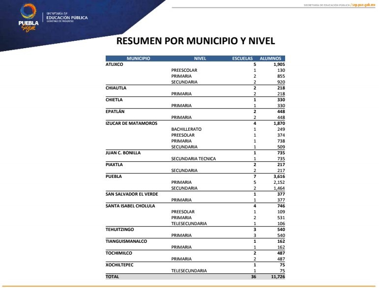 La Secretaría de Educación Pública (SEP) informó que tras una revisión minuciosa en todas las escuelas del estado de Puebla, se determinó que 36 serán demolidas por los graves daños ocasionados en su estructura por el sismo magnitud 7.1 ocurrido el 19 de septiembre, lo que obligará a la reubicación de 11 mil alumnos.