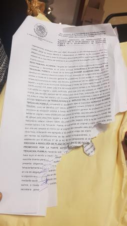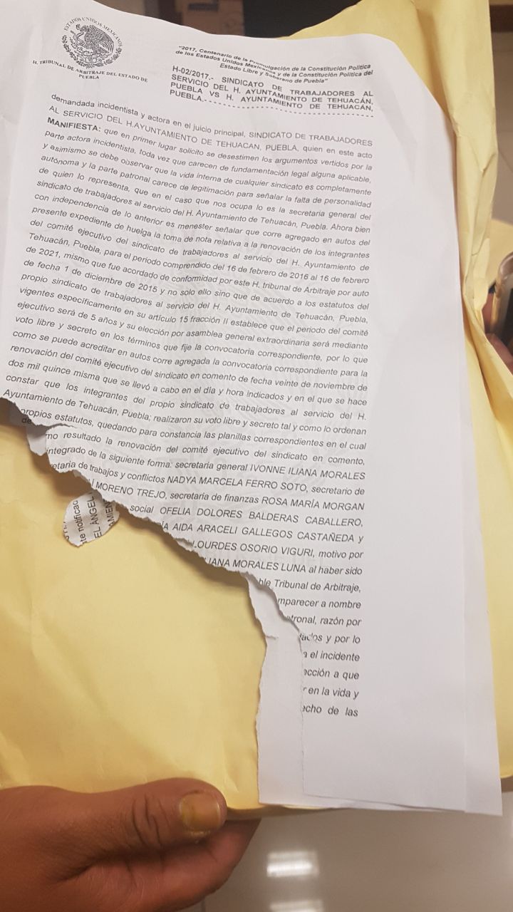El Ayuntamiento de Tehuacán hace responsable a través de esta denuncia pública al Tribunal de Arbitraje del Estado, de la privación ilegal de la libertad o perjuicios a servidores y funcionarios públicos del gobierno de esta ciudad y principalmente al presidente magistrado José Luis Ayala Corona por la actitud documentada del personal a su cargo; así como el responsabilizar de cualquier acto en perjuicio de funcionarios municipales a personas que han incitado a conflicto como son el diputado Leobardo Soto, líder estatal de la Confederación de Trabajadores de México (CTM), así como a Ivon (sic) Iliana Morales Luna y sus agremiados.