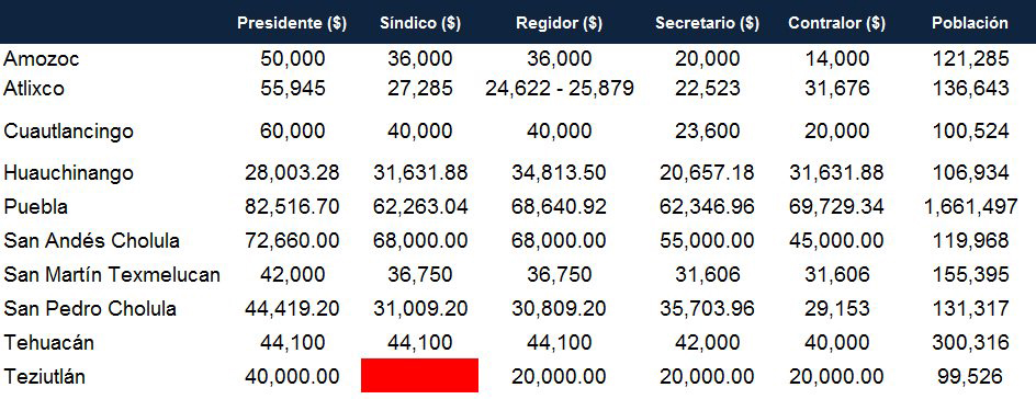El análisis del instituto tiene resultados similares en cuanto al tema de los síndicos y regidores, pues se repiten con montos altos frente a la población existente los casos de San Andrés Cholula y Cuautlancingo.