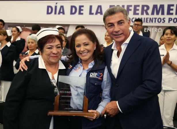 El gobernador Antonio Gali y la presidenta del Patronato del Sistema Estatal DIF, Dinorah López de Gali, entregaron 15 reconocimientos al mérito a los profesionales de la enfermería por contar con una trayectoria de 42 a 49 años de servicio, en el marco de la conmemoración del Día Nacional de la Enfermera y el Enfermero.