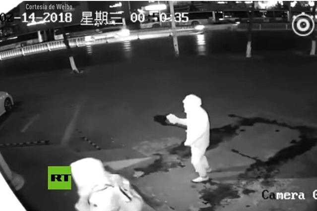 El 14 de febrero se publicó en la red social Weibo un video capturado por una cámara de seguridad en la que se ve a dos presuntos delincuentes que intentan romper el cristal de un establecimiento y asaltarlo.