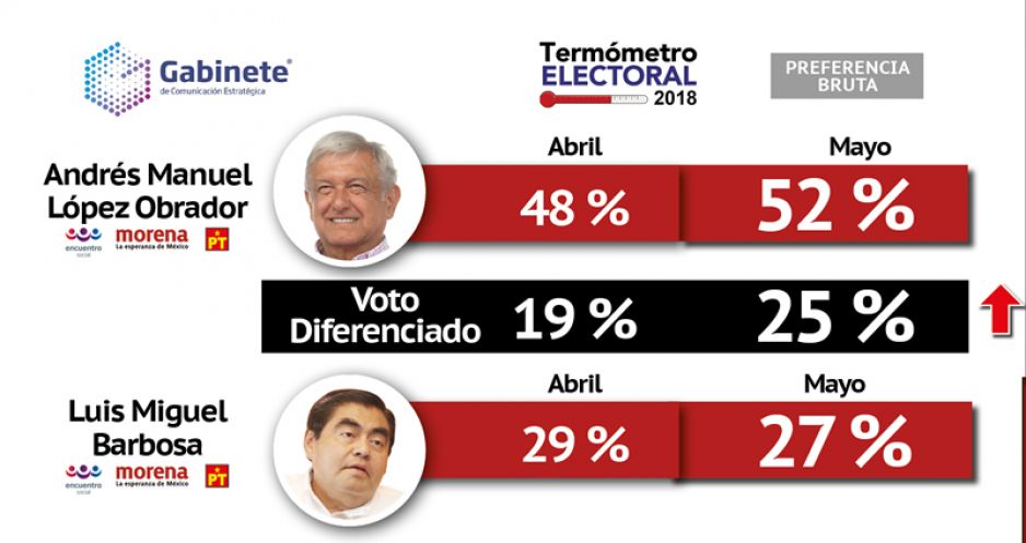 Sin embargo, en la medición anterior correspondiente a abril la brecha entre ambos era de 19 puntos, pues López Obrador recibía el 48 por ciento de la intención bruta de voto, mientras que el candidato a gobernador obtenía 29 por ciento. Es decir, entre un mes y otro, el voto diferenciado incrementó 6 puntos.