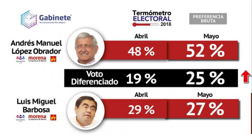 La brecha de voto diferenciado en Puebla entre Andrés Manuel López Obrador y su candidato Luis Miguel Barbosa continúa ensanchándose conforme se acerca la elección del 1 de julio. El abanderado presidencial de Morena tuvo un ligero crecimiento que le permitió llegar a 52 por ciento de la intención de voto bruta, mientras el aspirante a gobernador perdió dos puntos y se estacionó en 27 por ciento.