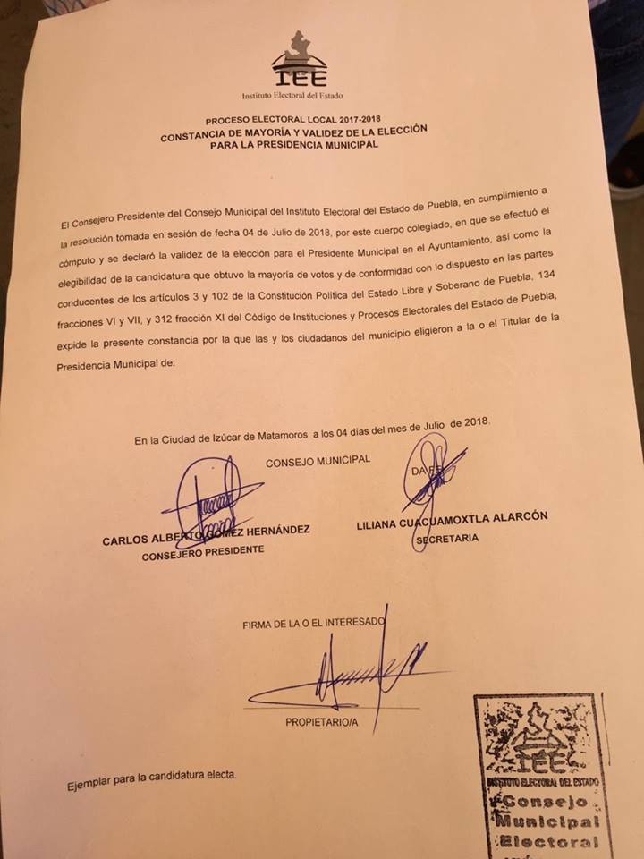 Izúcar de Matamoros, Pue.- El Consejo Municipal Electoral de Izúcar de Matamoros, entregó la constancia de mayoría y de legitimidad a Melitón Lozano Pérez, como alcalde electo para el periodo 2018-2021.