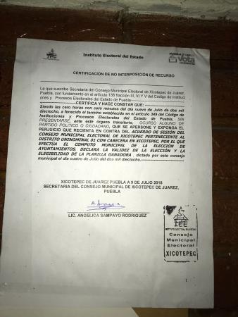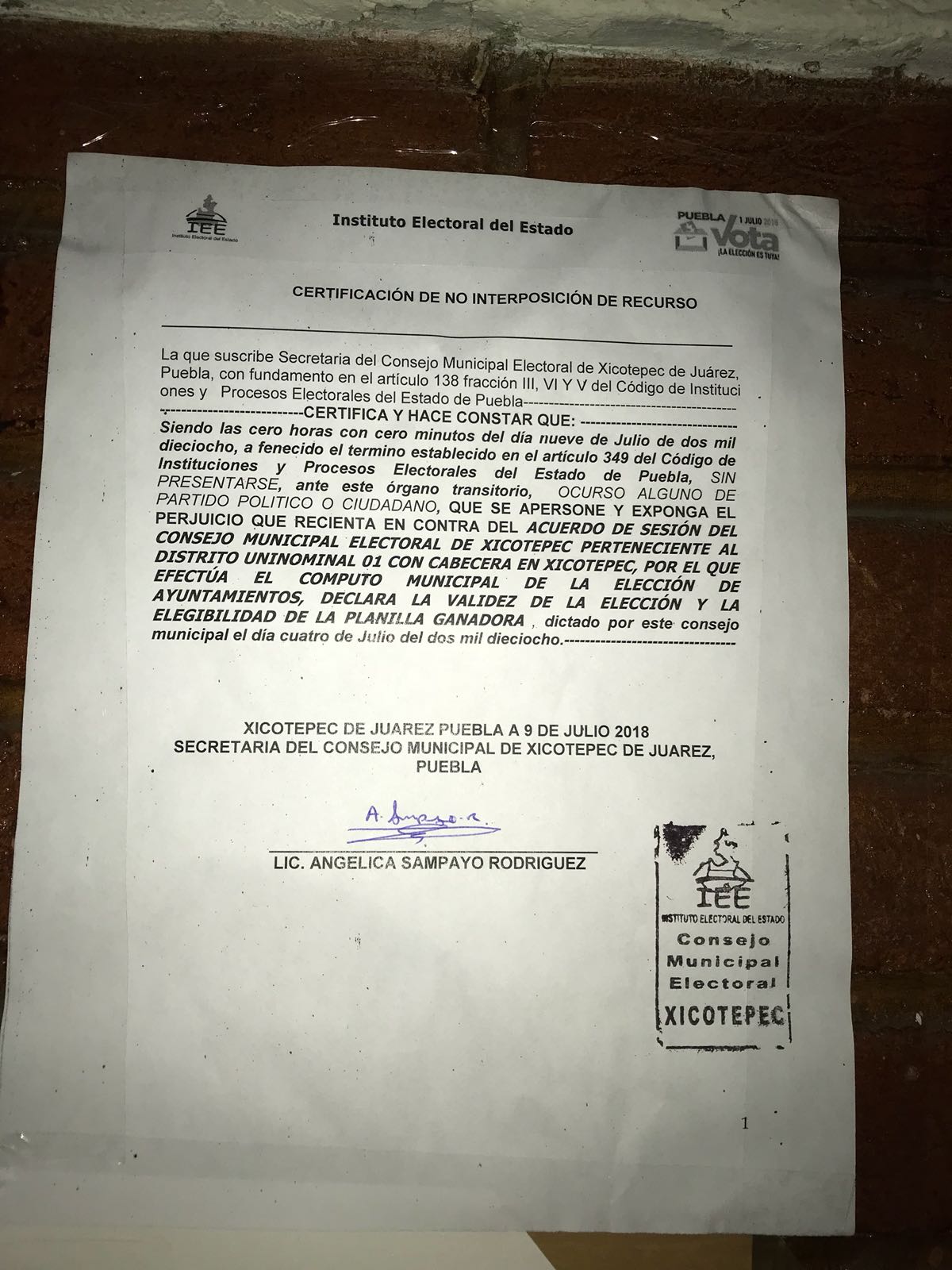 La titular de la Secretaría del Consejo Municipal Electoral, Angélica Sampayo Rodríguez, fue quien certificó por escrito que hasta las 00:00 horas de este 9 de julio no se había interpuesto ningún recurso de impugnación en contra del cómputo final.