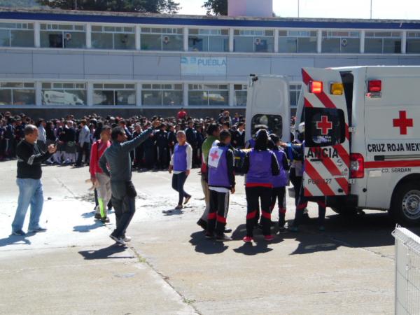A diferencia de otros años, en esta ocasión hubo más seriedad por los alumnos quienes ya tuvieron el año pasado la vivencia de un sismo real. Ambulancias y paramédicos de Cruz Roja, ambulancia del ayuntamiento y protección civil, simularon un derrumbe originado por el temblor e incluso se realizó un traslado de una persona lesionada.