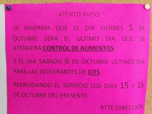 En el caso del hospital municipal el aviso que colocaron señala “Se informa que el día viernes 5 de octubre será el último día que se atenderá Control de Alimentos, el día sábado 6 de octubre último día para las integrantes del CITS. Reanudando el servicio los días 15 y 16 de octubre del presente. Atte. Dirección”.