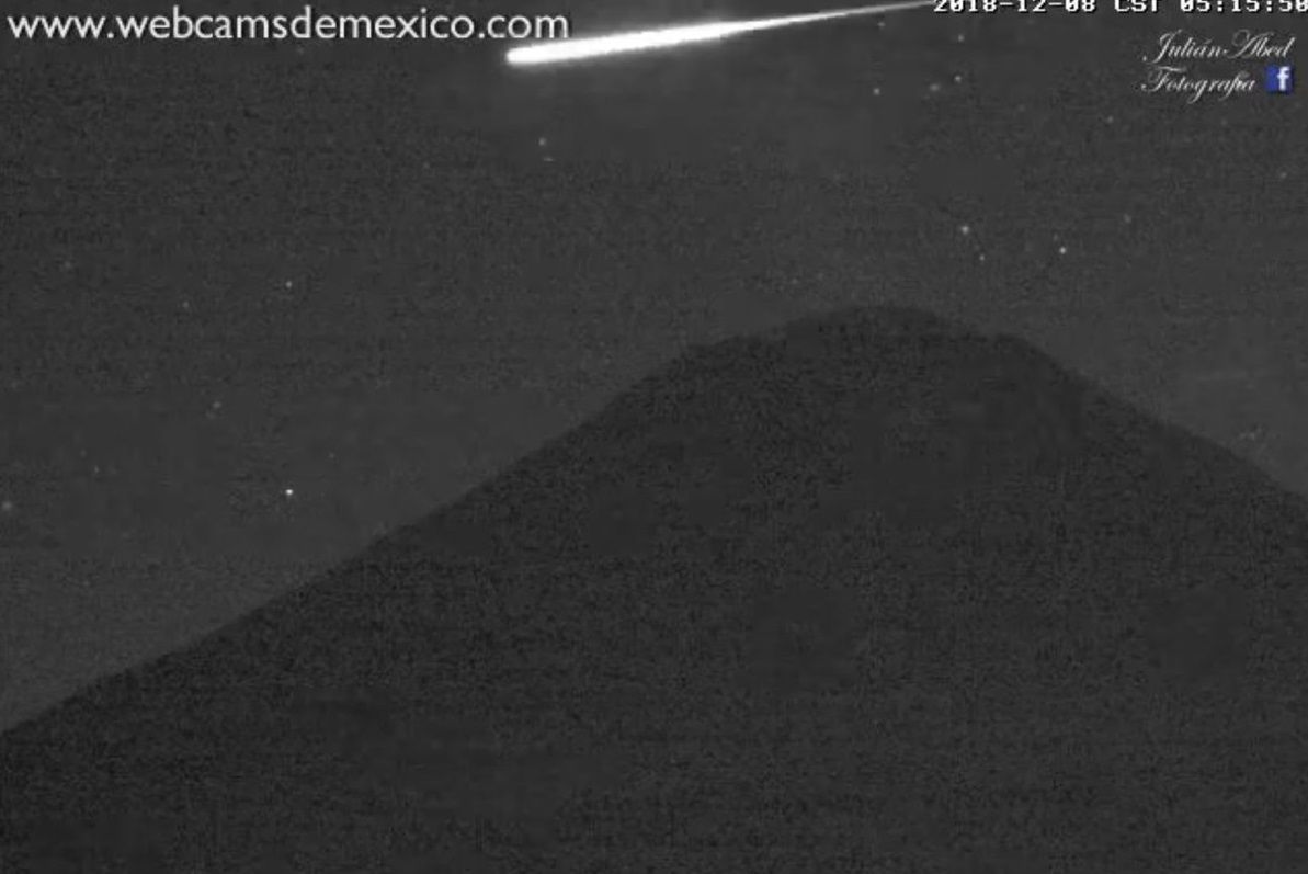 Puebla, Pue.- La madrugada de este día se observó un bólido (meteoro) en Morelos, Puebla, Estado de México y Ciudad de México, lo cual fue captado por la @webcamsdemexico del volcán Popocatépetl.