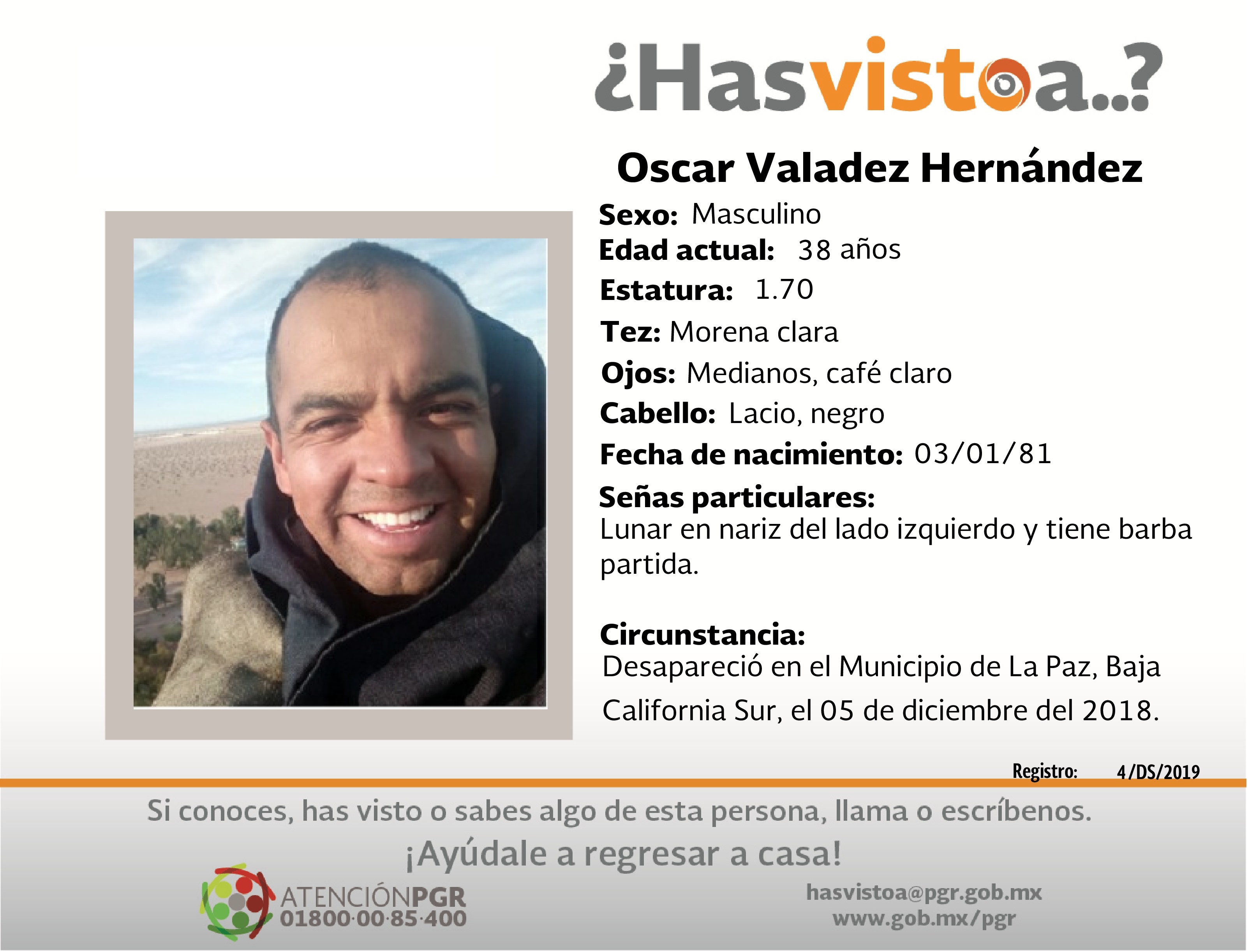 Desapareció en el municipio de La Paz, Baja California Sur, el 05 de diciembre del 2018.