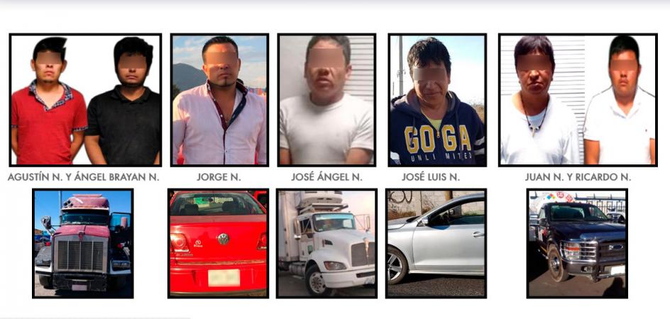 Por otra parte, en los municipios de Chietla, Huejotzingo, Acajete, San Salvador Huixcolotla, Libres, San Martín Texmelucan, Tepeaca e Izúcar de Matamoros, fueron asegurados Carlos N., Jorge N., Juan N., Ricardo N., José Ángel N., Jonathan N., Ramiro N., Misael N., Luis Fernando N., Dolores N. y Fernando N., quienes conducían las siguientes unidades: dos pipas de gas LP; tres marca Volkswagen, tipo Jetta; un Kenworth; un Honda tipo Civic; un Nissan tipo NP 300; Chevrolet, tipo Spark y una motocicleta, todos reportados como robados ante el sistema Plataforma México.