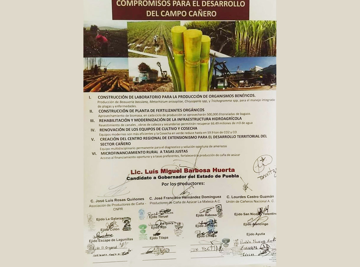 Izúcar de Matamoros.- Comisariados ejidales de la región de Izúcar de Matamoros dieron a conocer que se sienten satisfechos con la firma de compromisos para el desarrollo del campo cañero en esta zona, hechos por Luis Miguel Barbosa, candidato a la gubernatura del estado de Puebla por Movimiento de Regeneración Nacional Morena.
