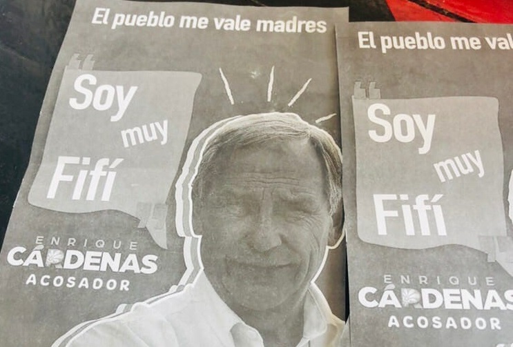 En las papeletas repartidas, aparece el rostro de Cárdenas Sánchez en gris con dos frases: “El pueblo me vale madres” y “Soy muy fifí”.