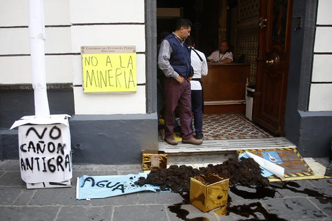 Los ejidatarios, representados por Oswaldo Villegas, del municipio de Cuyoaco, lanzaron estiércol a las puertas de la sede Legislativa ubicada en la 5 poniente 128, en el Centro Histórico, para exigir al gobernador interino Guillermo Pacheco Pulido el cese a las agresiones en su contra.