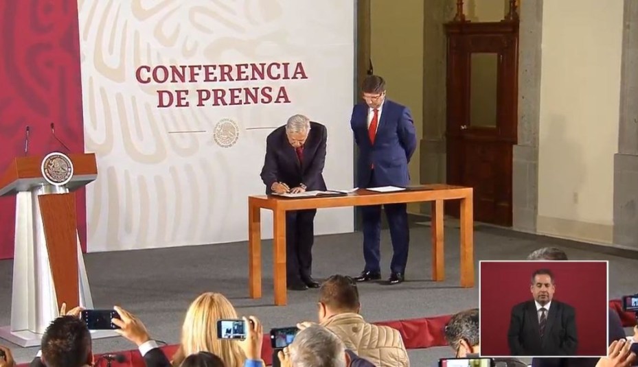 Este jueves, durante la conferencia matutina desde Palacio Nacional, el presidente Andrés Manuel López Obrador, firmó ante un notario público el documento que lo compromete a la no reelección presidencial y la no corrupción.