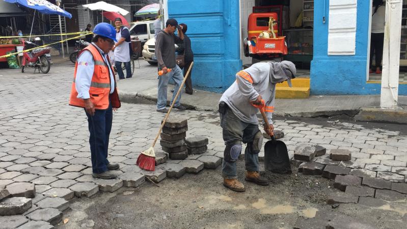 Desde este mediodía, empleados del Ayuntamiento comenzaron las labores para reparar los baches por donde pasan cientos de coches y miles de personas.