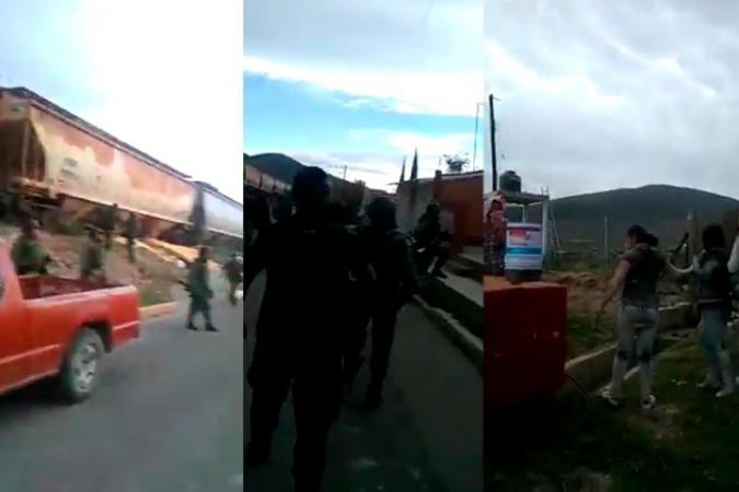 En la imagen se observa a personas en camionetas que están presuntamente por iniciar el saqueo a furgones cuando al lugar llega personal de la Guardia Nacional e intenta retirar a los pobladores.