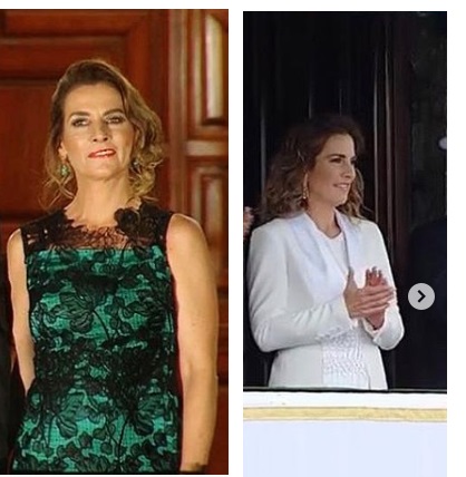 La noche del 15 de septiembre y durante el Desfile Militar de este lunes, la también historiadora lució un vestido y un traje elaborados por una marca mexicana.