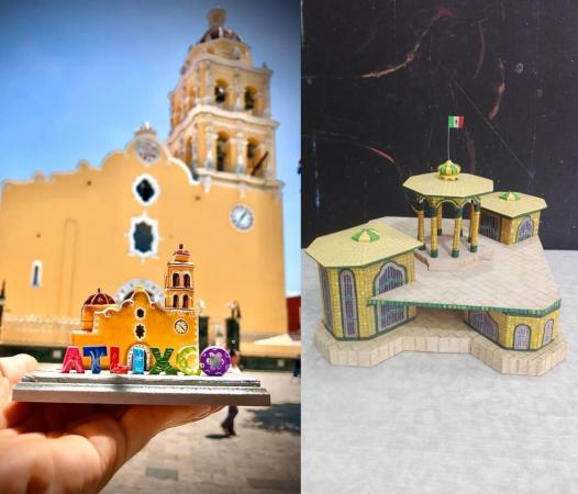 Atlixco, Pue.- La emblemática Parroquia o el histórico Kiosco del zócalo podrán ser adquiridos como artesanía o recuerdo por lugareños y turistas. Se trata de una obra a escala perfectamente diseñadas por un par de artistas atlixquenses.