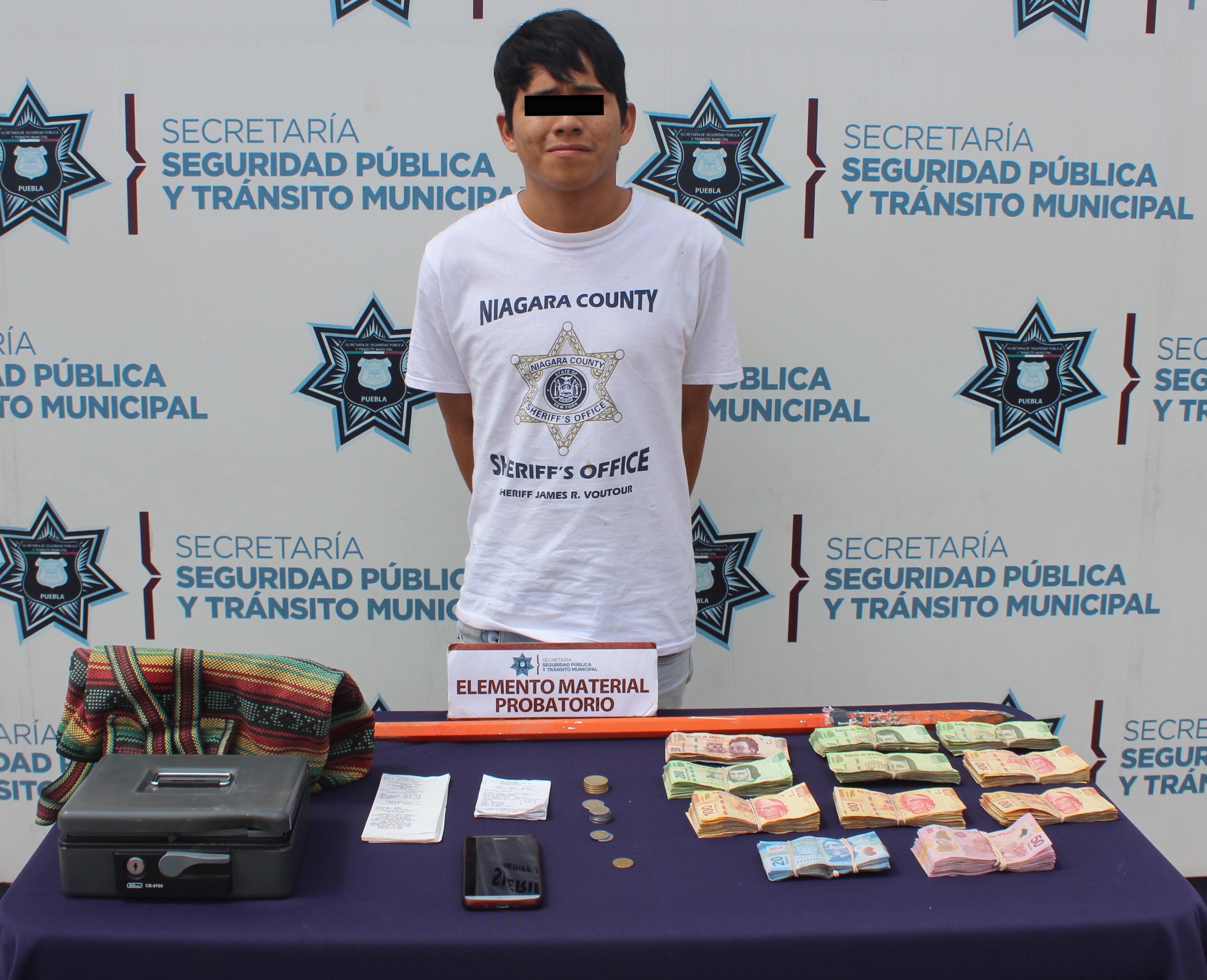 Puebla, Pue.- Como resultado de una oportuna intervención en la colonia Resurgimiento, la Secretaría de Seguridad Pública y Tránsito Municipal (SSPTM) de Puebla reportó la detención de Jovan “N.”, de 23 años de edad, por su probable participación en hechos con apariencia de delito de robo de empleado.