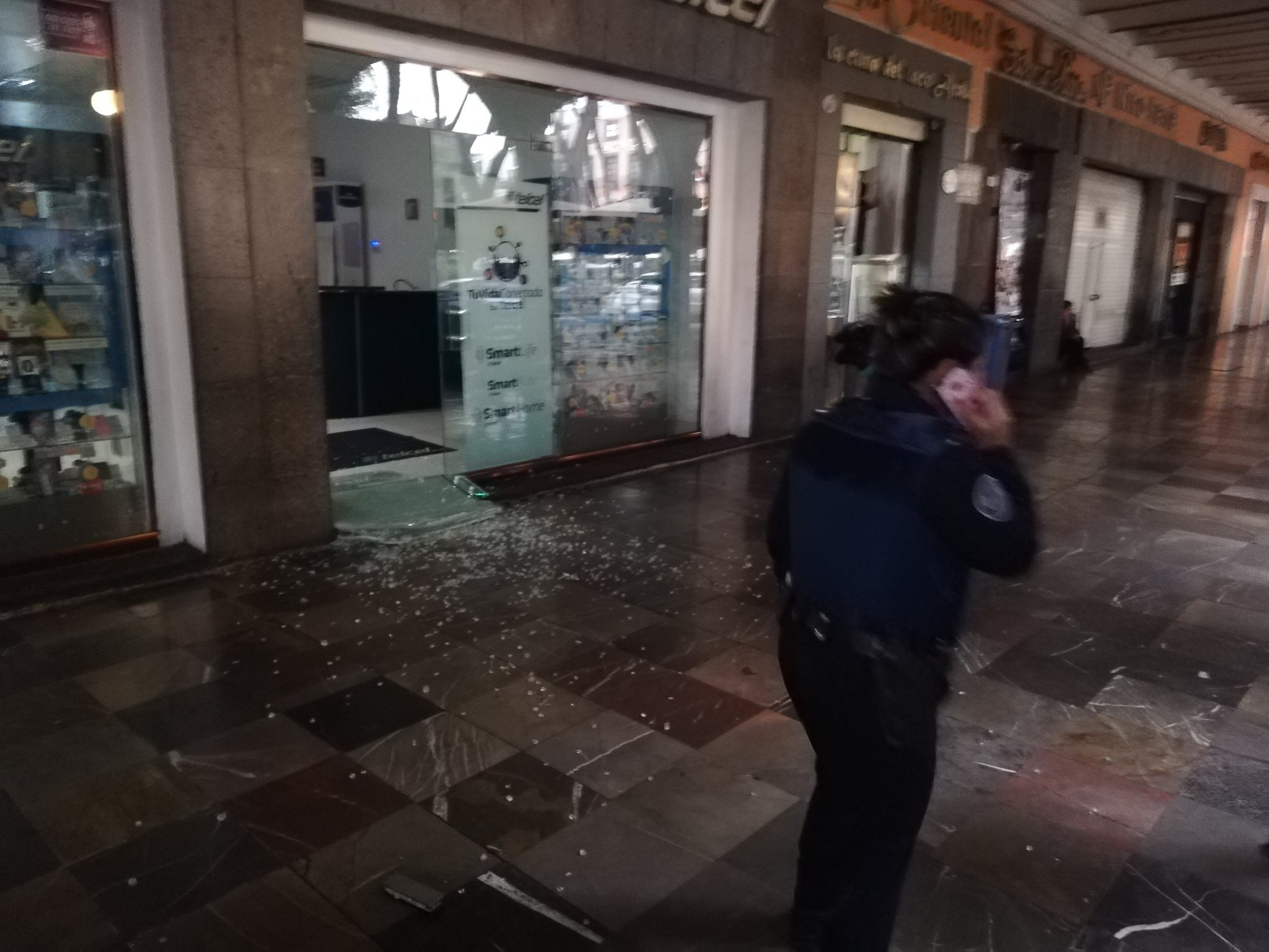 Cristalazo a Telcel del zócalo de Puebla