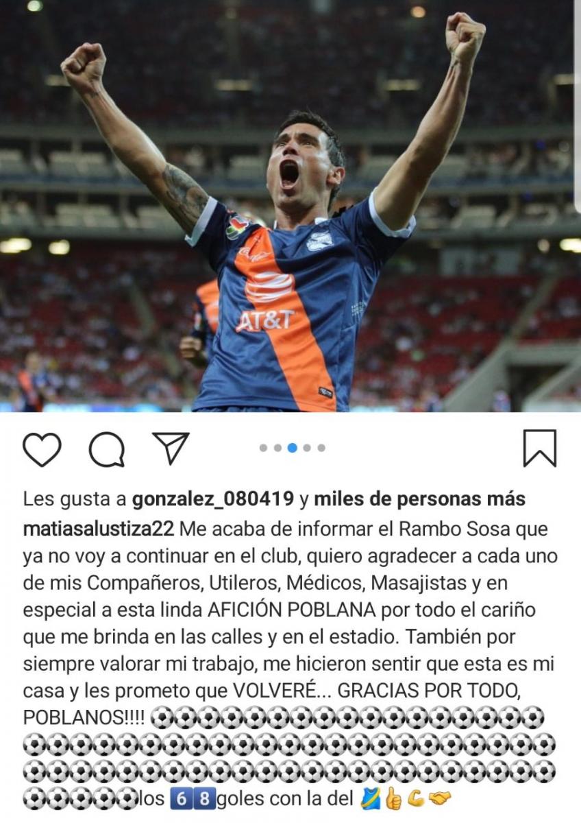 "Me acaba de informar el Rambo Sosa que ya no voy a continuar en el club. Quiero agradecer a cada uno de mis compañeros, utileros, médicos, masajistas y en especial a esta linda AFICIÓN POBLANA por todo el cariño que me brinda en las calles y en el estadio", escribió en Instagram.