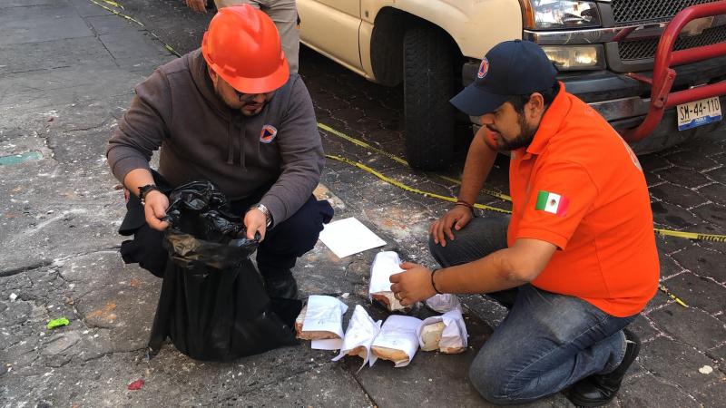 Frente al templo habían quedado varios fragmentos que lesionaron al menor y su padre, dispersas en la banqueta y frente a una de las entradas principales de esa iglesia construida en el siglo XVI.