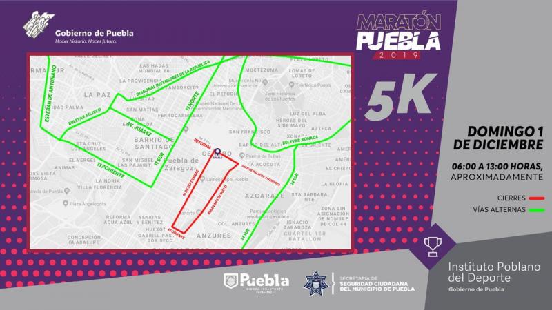 Puebla, Pue.- Este domingo 1 de diciembre se realizará el Maratón de Puebla 2019, por lo que permanecerán cerradas diversas vialidades de la zona metropolitana, en un horario de 06:00 a 13:00 horas.