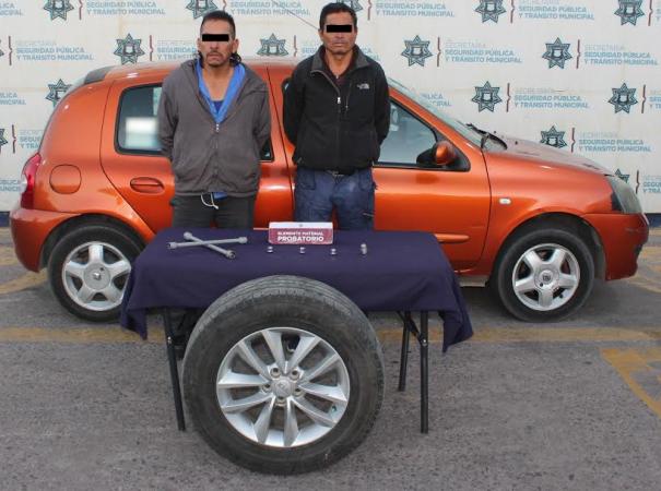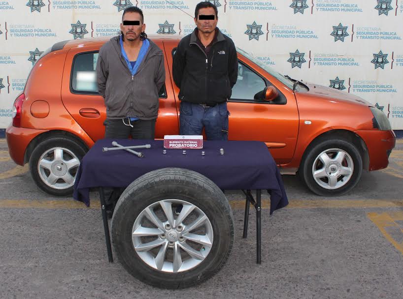 A su llegada, los elementos sorprendieron a dos masculinos quienes sustraían un neumático a una camioneta marca Kia, tipo Sorento, color gris, para posteriormente intentar darse a la fuga a bordo de un vehículo Renault, Clío, color naranja.