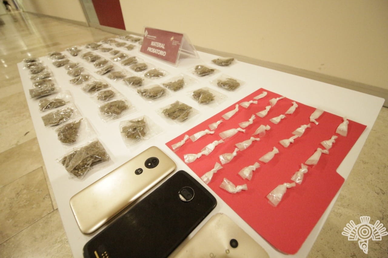 Los presuntos vendedores de droga responden a los nombres de Daniela N., alias “La Polla”, de 20 años, y Alexis H., de 19 años, a quienes se les encontró en posesión de sustancias con características propias de las drogas conocidas como cocaína (29 dosis) y marihuana (50 bolsas pequeñas), además de tres teléfonos celulares que presuntamente utilizaban para contactar a sus clientes.
