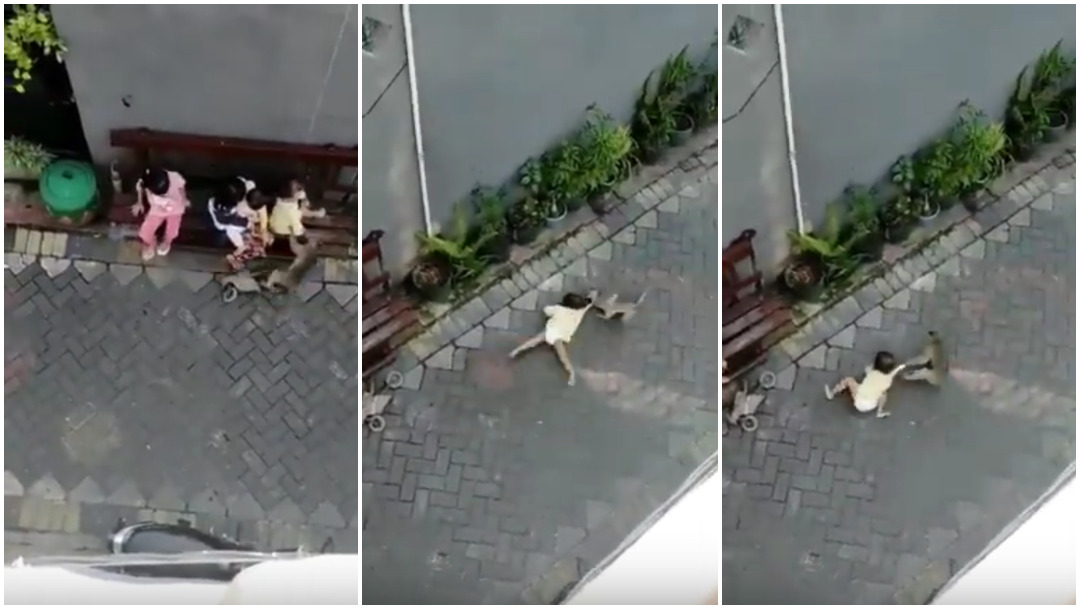 En el video se aprecia como un mono montado en una bicicleta de juguete se acerca a unas niñas en la banqueta, el animal luego se agarra a la pierna de una de las niñas y la arrastra por la calle.