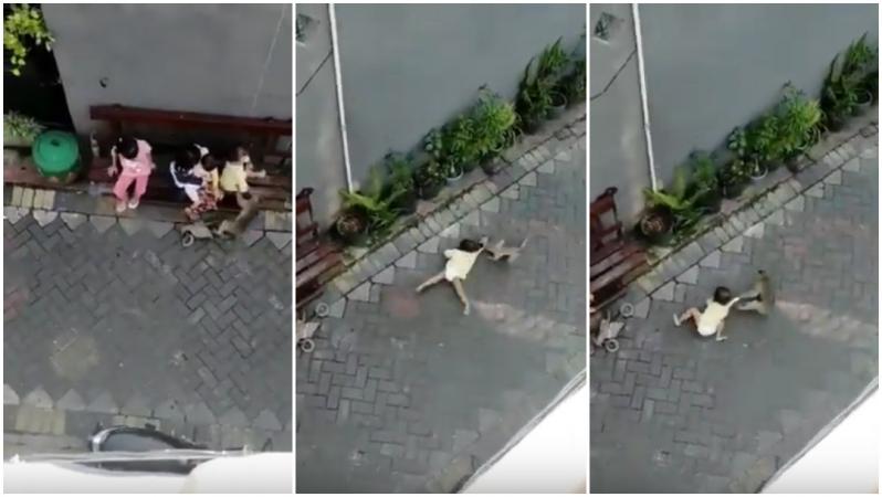 VIDEO Desde su bicicleta, mono intenta robarse una pequeña niña