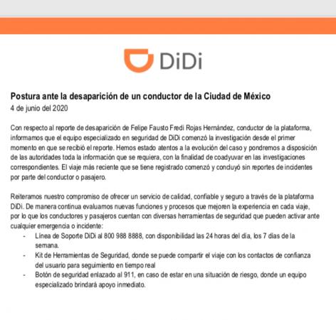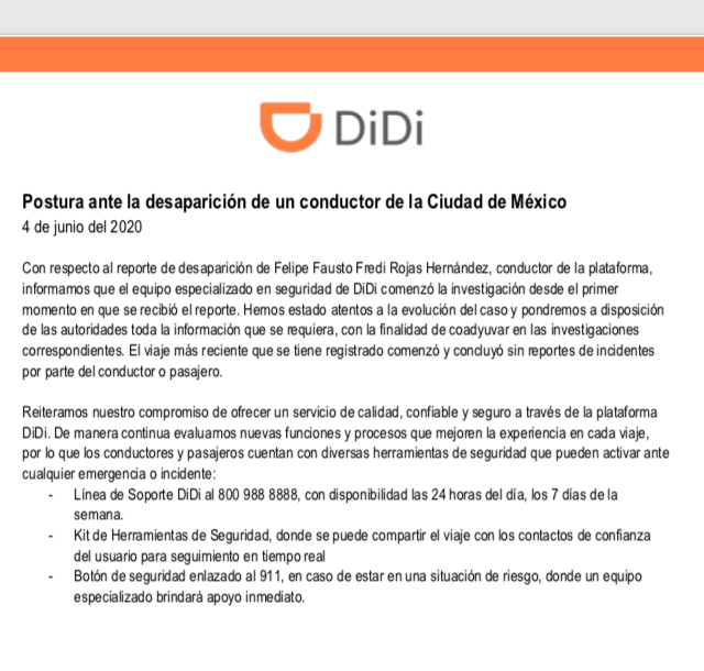 La empresa Didi, a la que pertenece Felipe, rastreó la unidad y la ubicó en San Martín mediante el GPS del vehículo. No obstante ni la unidad ni Felipe Fausto han sido localizados.