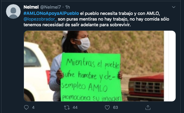 @lopezobrador_ la gente se muere de hambre. #AMLONoApoyaAlPueblo”, decía uno de los mensajes en redes sociales.