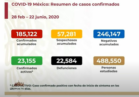 Asimismo, se han registrado 22585 fallecimientos en le país por Covid-19 y se han estudiado a un total de 488550 mexicanos hasta el momento