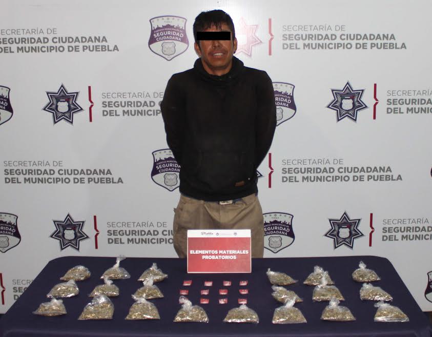 Puebla, Pue.- Resultado de una oportuna intervención en la colonia 20 de Noviembre, la Secretaría de Seguridad Ciudadana (SSC) del Municipio de Puebla detuvo a Alejandro “N.”, de 29 años de edad, por su probable participación en hechos con apariencia de delitos contra la salud.