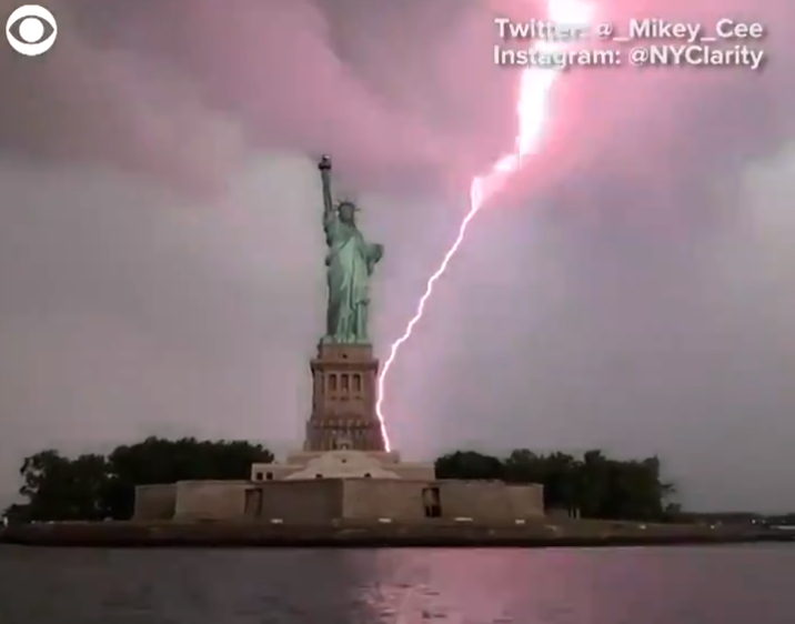 Un usuario de Twitter logró capturar el momento en el que un rayo impactó por detrás a la Estatua de la Libertad.