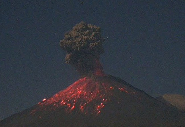 Puebla, Pue.- Esta madrugada continuó la expulsión de fragmentos incandescentes que emitió a las 21:00 hrs de ayer el volcán Popocatépetl