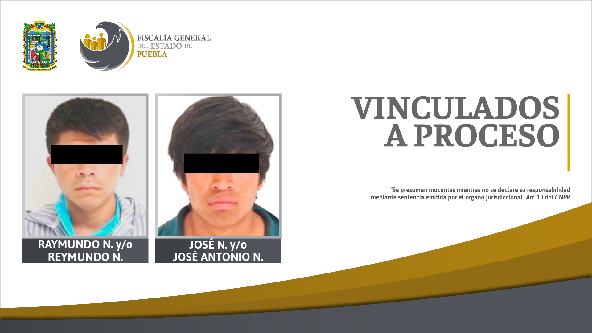 Tehuacán Pue.- Al aportar datos sustentados, la Fiscalía General del Estado de Puebla obtuvo del Juez de Control, la vinculación a proceso con prisión preventiva contra Raymundo N. y/o Reymundo N. de 24 años de edad, y José N. y/o José Antonio N. de 19 años de edad, presuntos responsables de robo de vehículo agravado y delitos contra la salud.