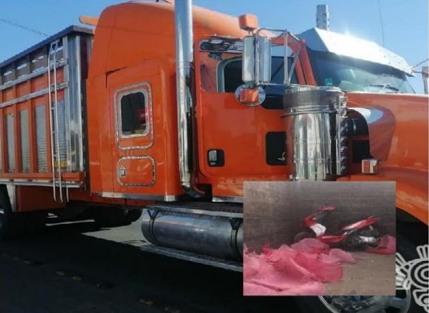 Tras una revisión en la caja de carga del tractocamión, los elementos encontraron una motoneta de color rojo que está reportada como robada.