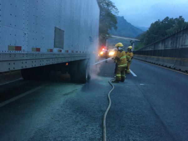 La pesada unidad era tripulada por, Omar N., quien al percatarse que las llantas del segundo eje del remolque se estaban incendiando, orillo a la unidad y solicito el apoyo de la Guardia Nacional, que a la vez solicitó la presencia del Cuerpo de Bomberos de Huauchinango.